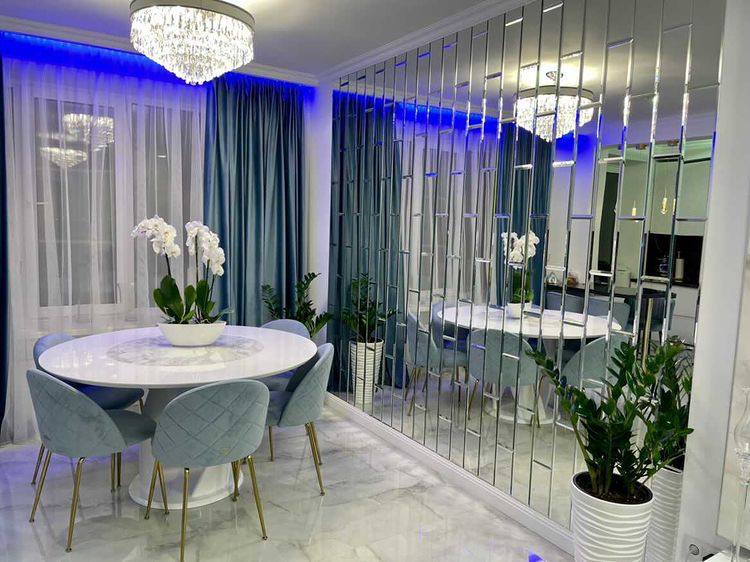 Для украшения использовалась зеркальная плитка формы вытянутый ромб серебряного цвета.